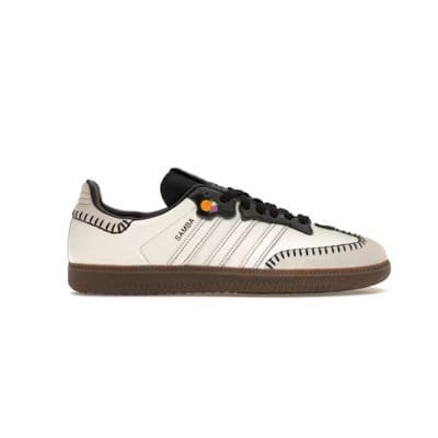The adidas Samba OG Día de Muertos Pack Off White is an athletic shoe featuring an Off White leather upper accented by contrast stitching and a lace panel in Core Black. Samba branding accents the monochrome contrast stitch signature 3-Stripes, while embroidered marigold images in Crew Orange accent the lace panel. A skull image appears on the tongue, and a dark gum rubber outsole finishes the look.