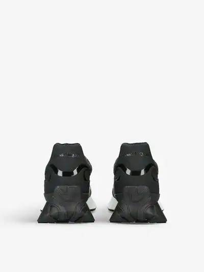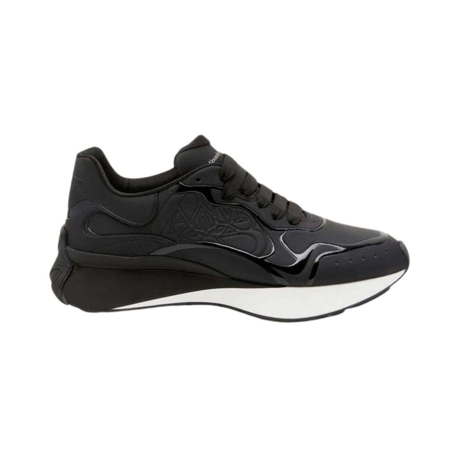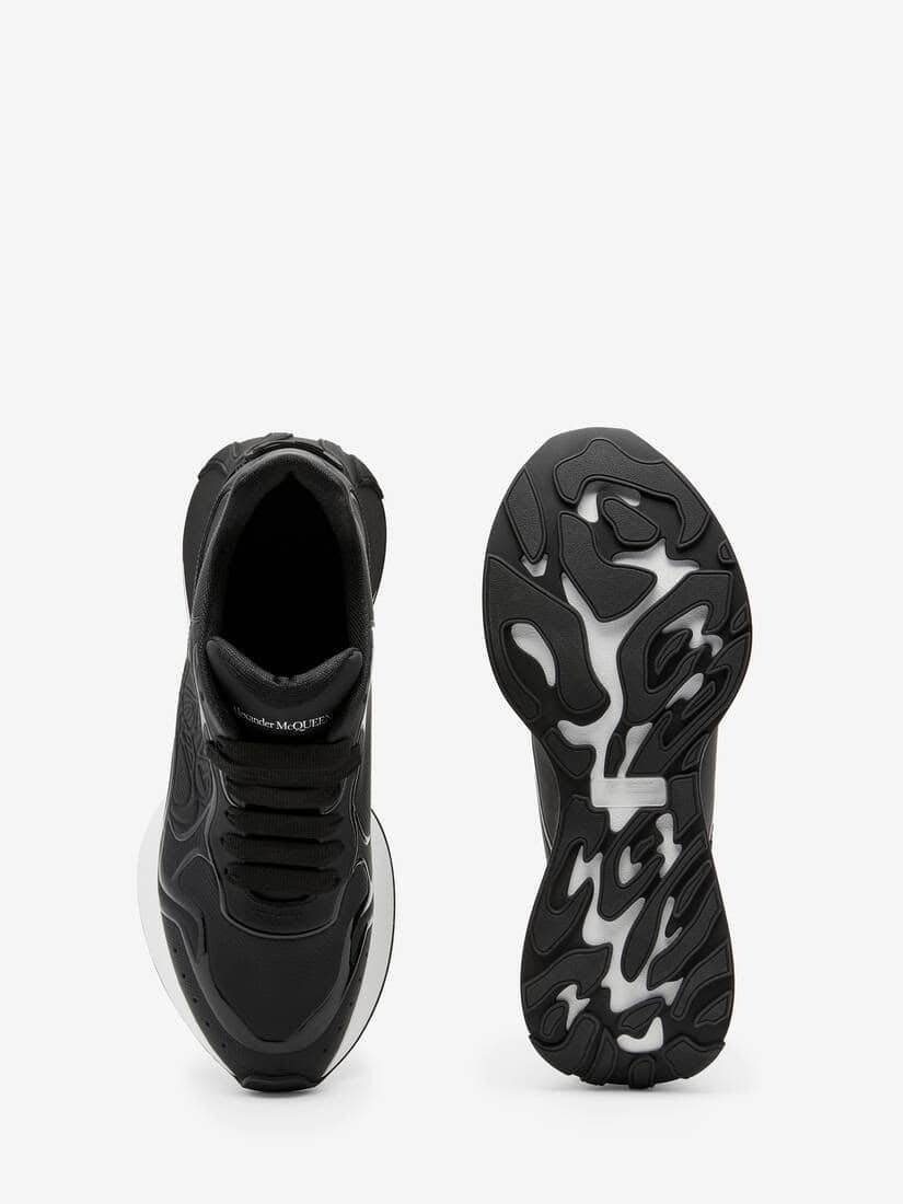 Presented in black leather, this Sprint Runner features an embossed leather upper with technical print and glossy tonal detailing. The sneaker is finished with a tonal Seal Logo on the side and an Alexander McQueen signature on the heel counter