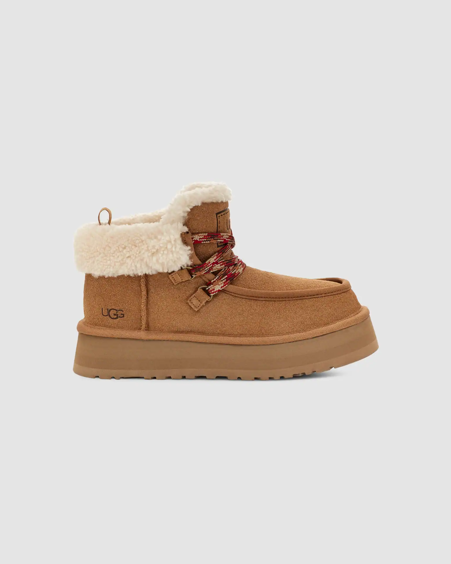 The Funkarra is always invited to the annual winter cabin getaway trip with the girls. We’d like to introduce you to our frosty weather BFF, The Funkarra Cabin Cuff. She brings the best snacks, builds the best campfires, and will laugh with you all night long. This boot offers the look of a bootie and the feel of a slipper with a bold 1.5″ platform. It features statement laces to accent its fixed cuffed collar. Our beloved soft suede upper pairs with a soft UGGplush™ lining for a cushioned feel and elevated look